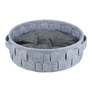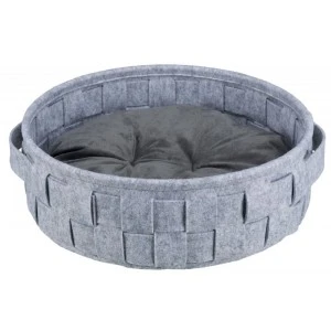 Trixie Mand Lennie 40cm Trixie Mand Lennie is een moderne mand voor jouw kat of kleine hond. Heerlijk wegdromen: of het nu om een korte pauze of een diepe slaap gaat met Mand Lennie van Trixie kan jouw kat heerlijk ontspannen en uitrusten. Het gevlochten vilt maakt de mand ook nog eens mooi om te zien. Producteigenschappen: Inclusief kussen met een pluche bekleding en polyestervlies vulling Isolerend en vuil afstotend Materiaal: vilt Diameter: 40 cm Geschikt voor katten en kleine honden